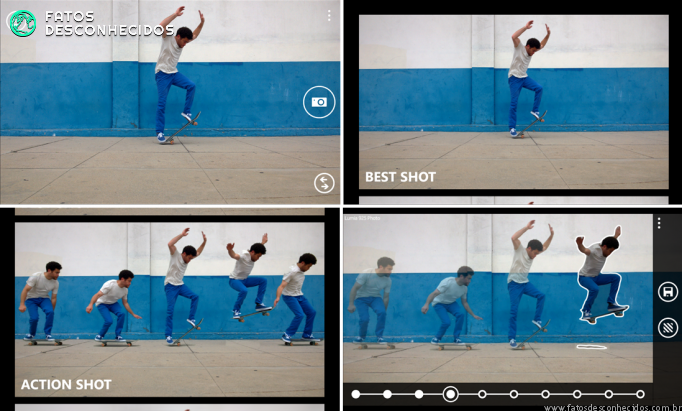 Sabe quando você vai tirar aquela foto perfeita, de um monumento, por exemplo; mas acaba passando alguém na frente? Pois é, o windows Phone (Nokia) dá um jeitinho para você. O aplicativo Nokia Smart Cam permite que várias fotos do mesmo local sejam muito rápido para que depois você escolha o melhor “disparo” ou para que você possa apagar os elementos (especialmente pessoas) em movimentos que atrapalhariam sua imagem em outros aparelhos.